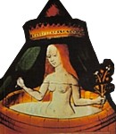 It shows a woman bathing in a large, canopied wooden tub. Bathing